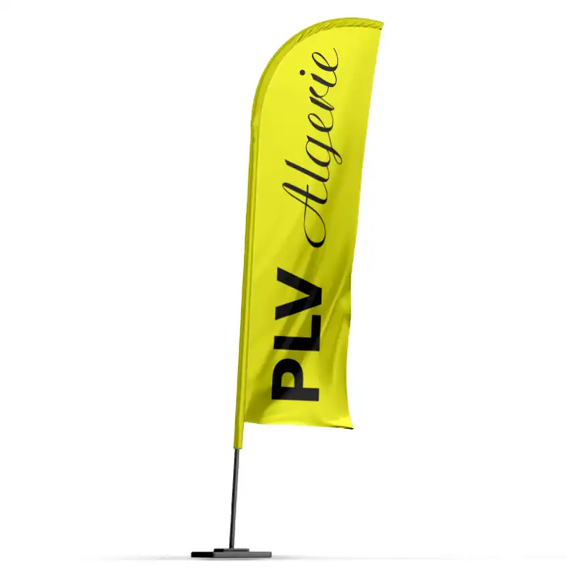 des Beach flags. Nous vendons depuis des années des Beach flags de la qualité top à un prix favorable. Nous avons disponible un large assortiment de Beach flags avec les accessoires liés. Des options comme l’impression recto verso ou bien le format spécifique au client font partie des possibilités chez PLV Algérie